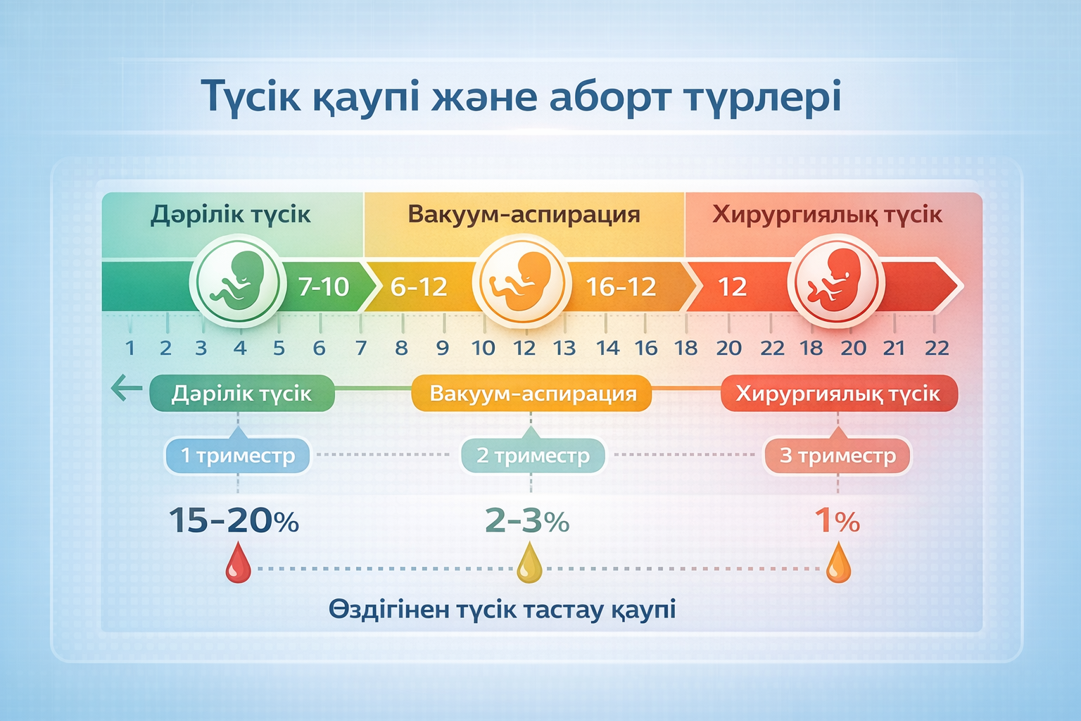 Графикада 1-ден 22 аптаға дейінгі жүктілік мерзімін көрсететін көлденең сызық бейнеленеді. 7-10 аптаға дейін «Дәрілік түсік» (жасыл аймақ), 6-12 апта аралығында «Вакуум-аспирация» (сары аймақ), 12 аптадан кейін «Хирургиялық түсік» (қызғылт сары аймақ) белгіленеді. Шкаланың төменгі жағында жүктіліктің әр триместріндегі өздігінен түсік тастау қаупінің пайызы көрсетіледі.