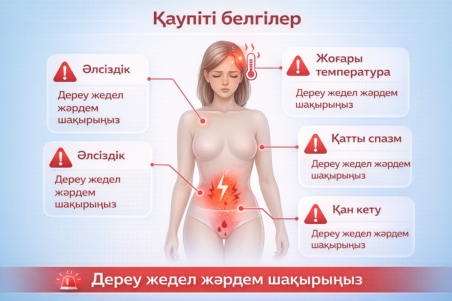 Әйел денесінің контуры бейнеленген сурет. Онда қызыл леп белгілері арқылы сыни симптомдар көрсетіледі: қан кету (қынап тұсы), қатты спазм (іш аймағы), жоғары температура (бас аймағы) және әлсіздік (жүрек/тамыр соғысы аймағы). Әр белгінің жанында «Дереу жедел жәрдем шақырыңыз» деген ескерту тұрады.